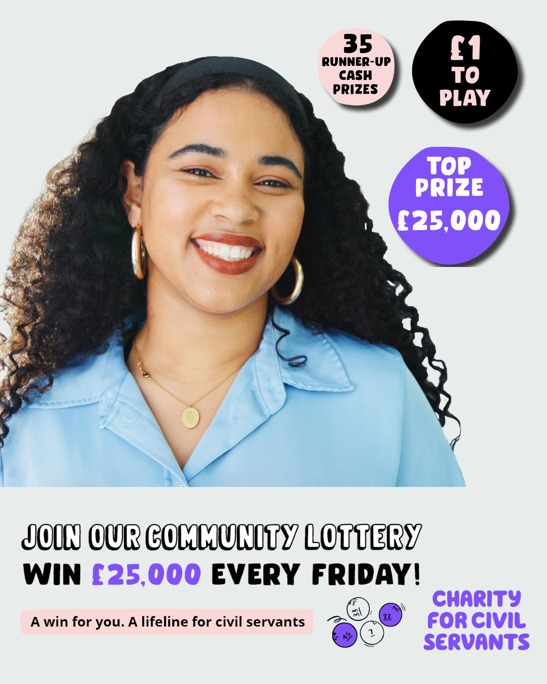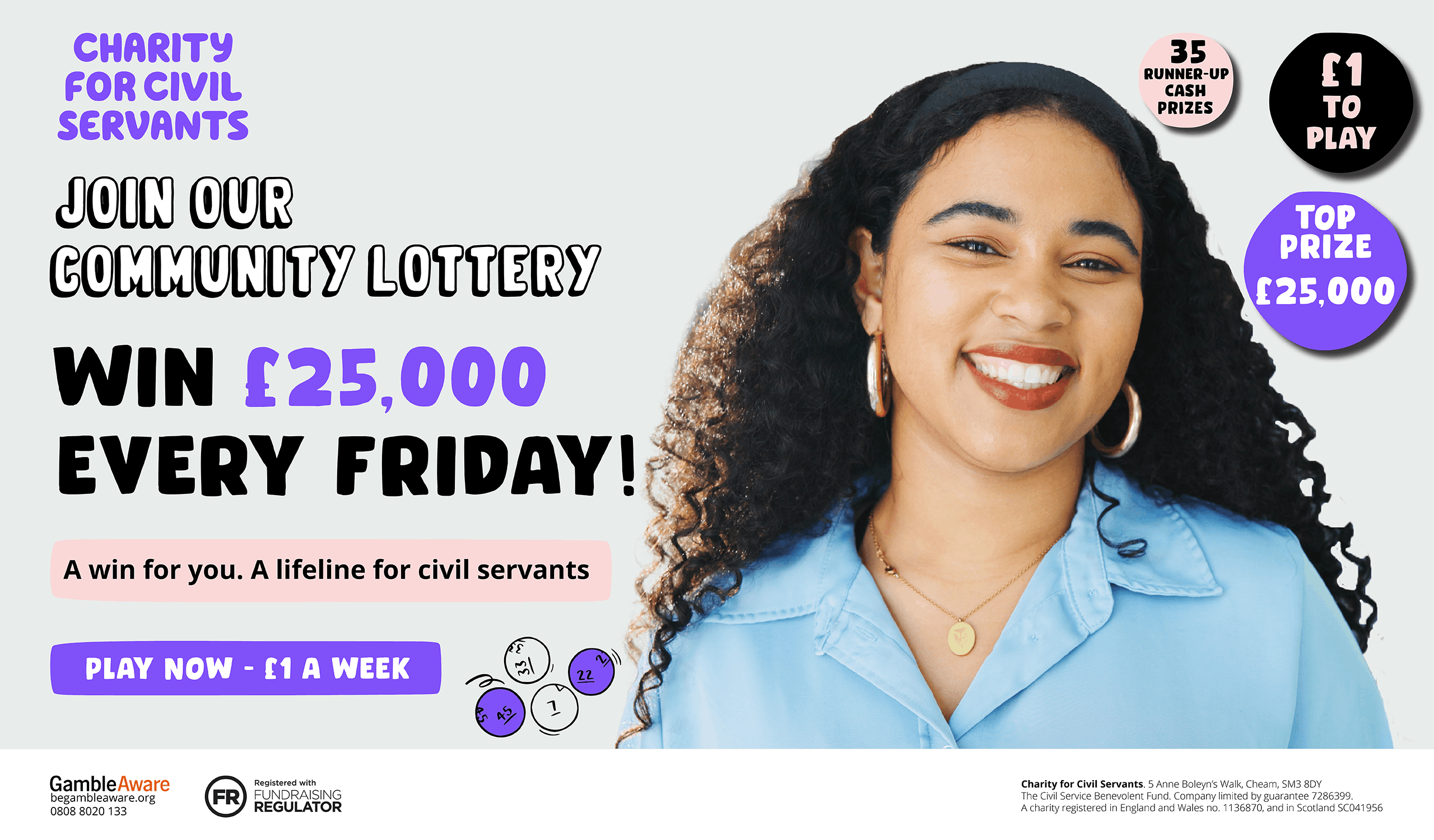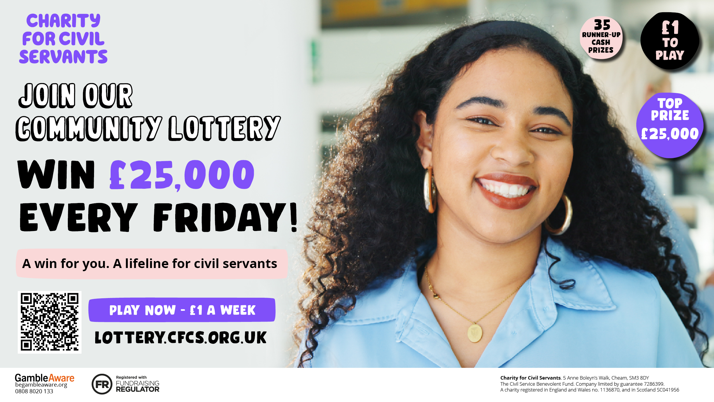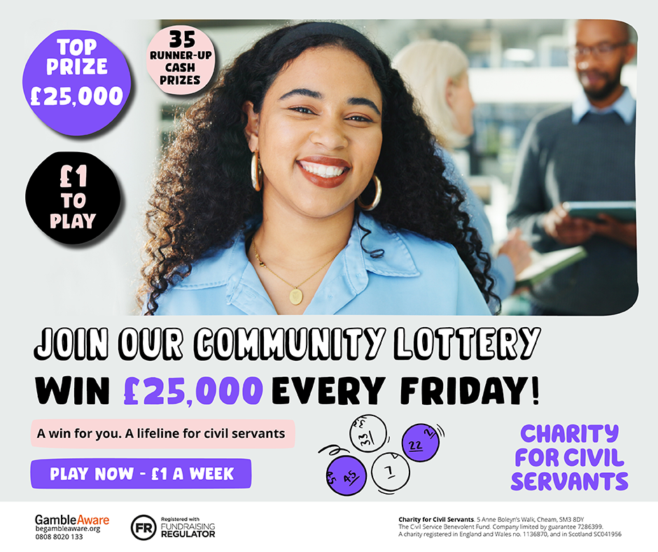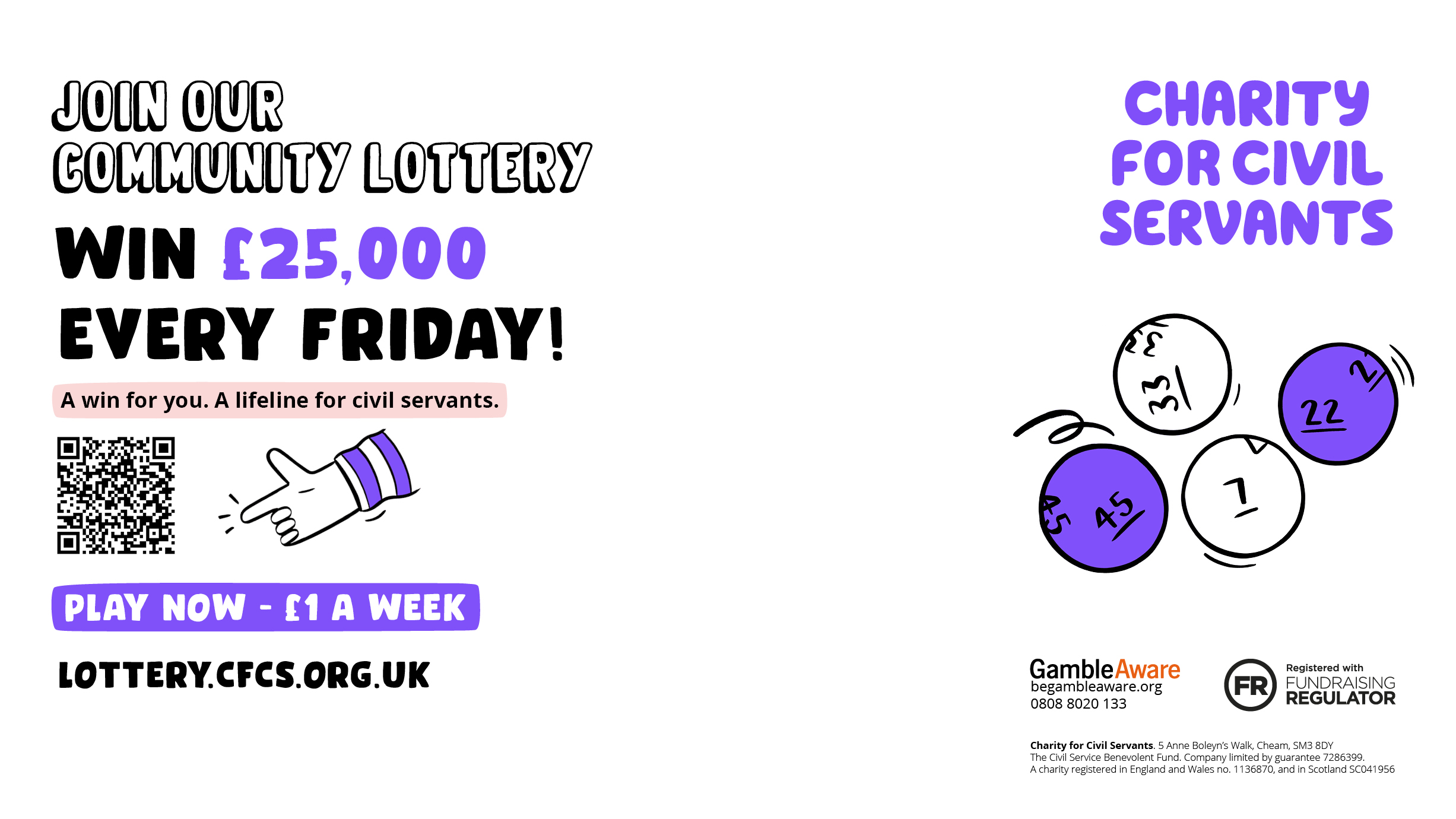 Each pack contains everything you need to promote our Community Lottery to your colleagues: 4 lottery posters, 1 Charity for Civil Servants poster, 40 ‘About Us’ leaflets, 40 Community Lottery leaflets, 40 Community Lottery business cards.